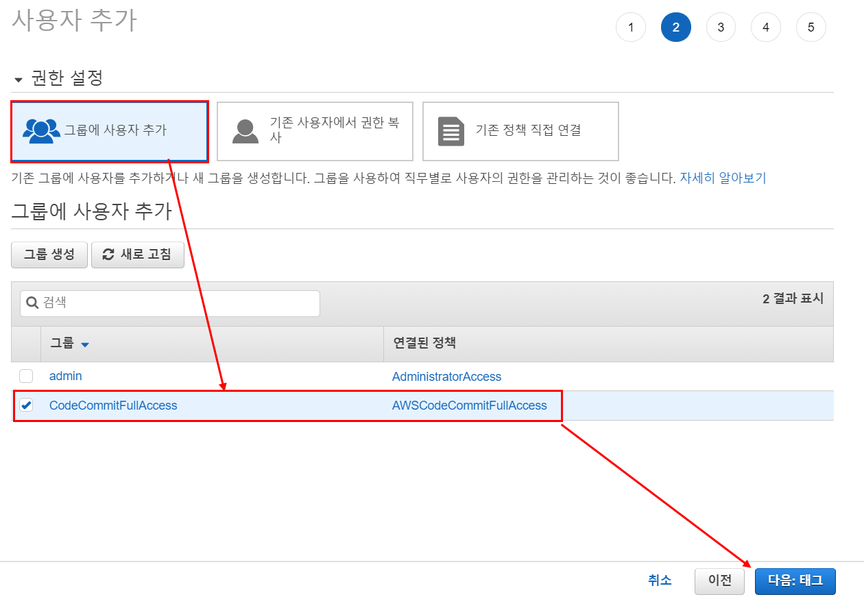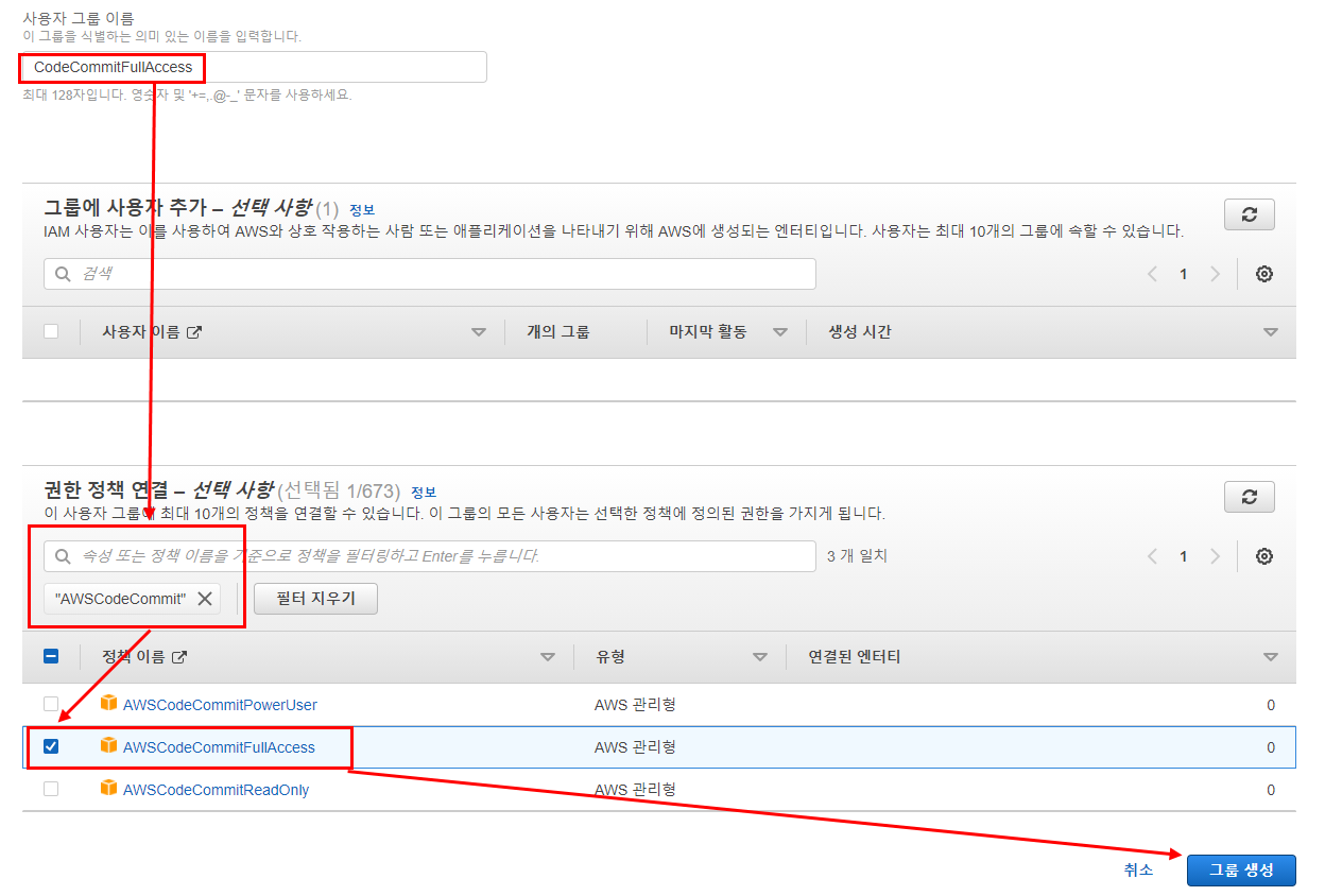 1) 기본설정 1-1) 깃 HTTPS ID/PW 연결 사용할 IAM의 사용자에, '권한'에 "AWSCodeCommitFullAccess" 추가. 사용할 IAM의 사용자에, '보안 자격 증명'에 "AWS CodeCommit에 대한 HTTPS Git 자격 증명" 생성. CodeC..