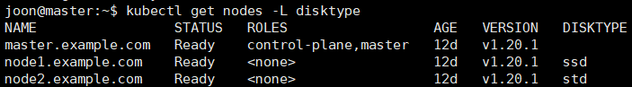 $ sudo kubectl get nodes -L disktype