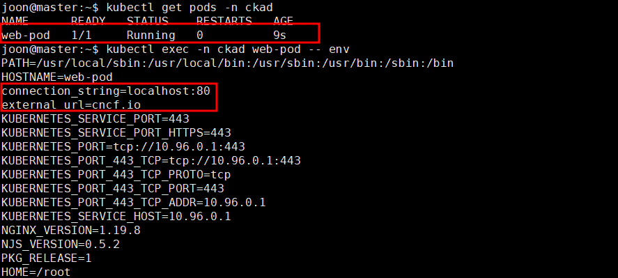 3. Run a pod called web-pod with a single container running the nginx:1.19.8-alpine image, and expose these configuration settings as environment variables inside the container.