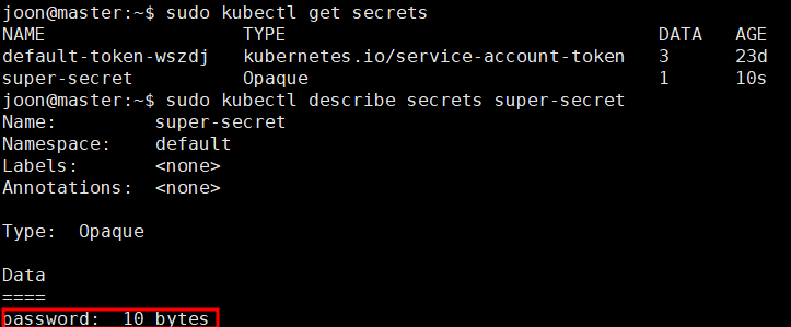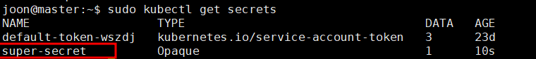$ sudo kubectl create secret generic super-secret --from-literal=password=secretpass