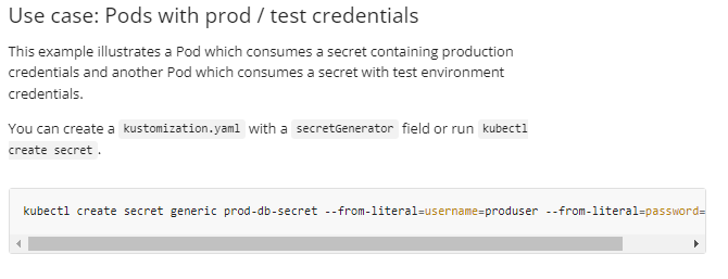 https://kubernetes.io/docs/concepts/configuration/secret/#use-cases 에서 Secret 생성 명령어 참고