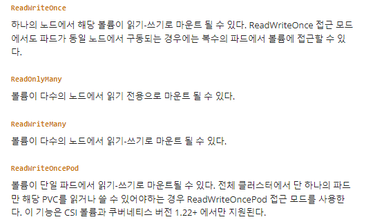 - RWO : Read Write Once- RWX : Read Wirte Many- ROX : Read Only Many