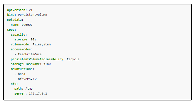 - 쿠버네티스 관리자가 PV 를 프로비저닝 해두고 Pod 를 생성할 때 PV 디스크를 요청하면 요구 조건에 맞는 PV를 쿠버네티스가 찾아 할당하게 된다.