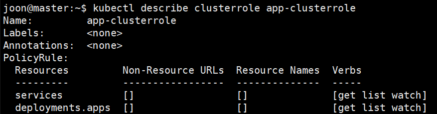 $ kubectl create clusterrole app-clusterrole --verb=get,list,watch --resource=deployment,service