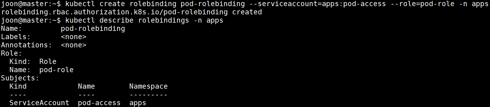 $ kubectl create rolebinding pod-rolebinding --serviceaccount=apps:pod-access --role=pod-role -n apps