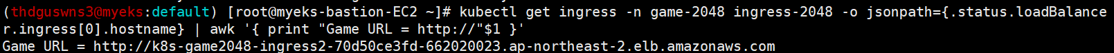 kubectl get ingress -n game-2048 ingress-2048 -o jsonpath={.status.loadBalancer.ingress[0].hostname} | awk '{ print "Game URL = http://"$1 }'