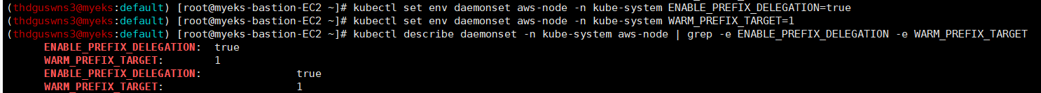 $ kubectl set env daemonset aws-node -n kube-system ENABLE_PREFIX_DELEGATION=true