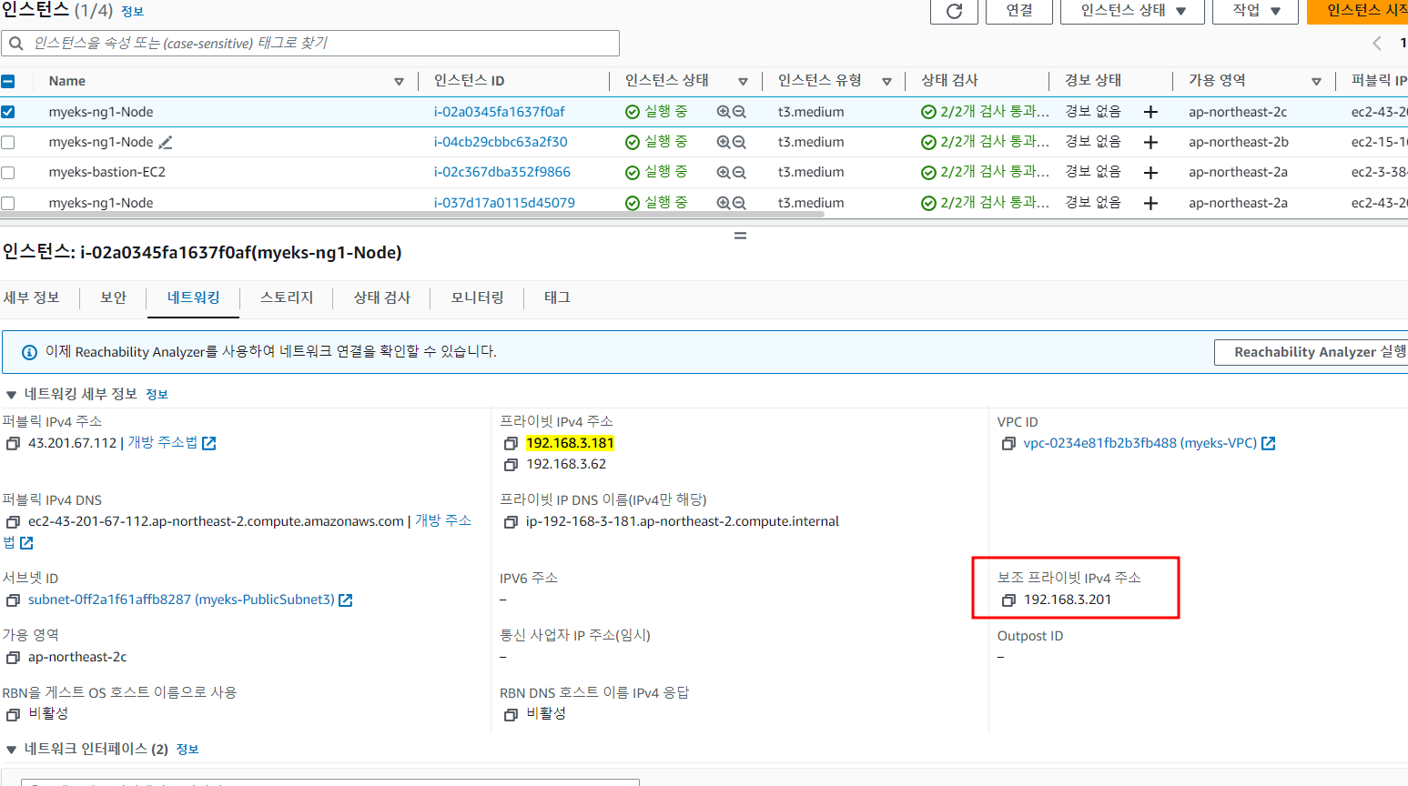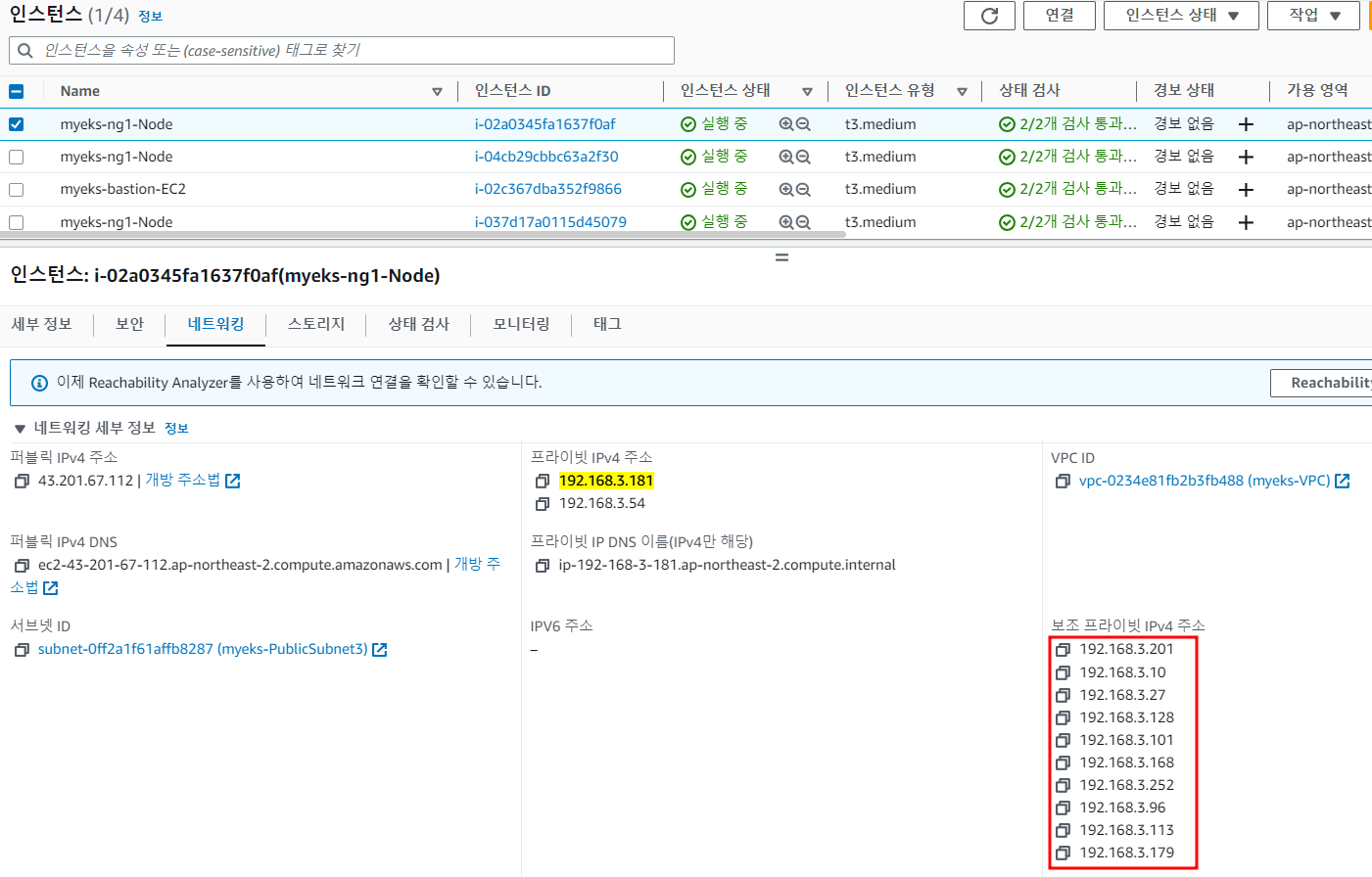 노드의 Private IP주소와 kube-proxy, aws-node POD의 IP 주소가 같다는 것을 알 수 있습니다.