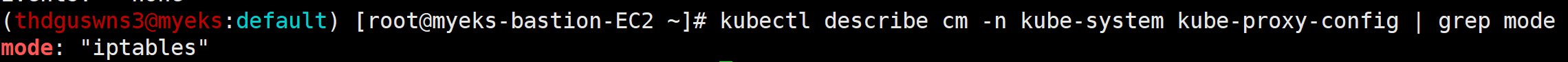 AWS VPC CNI는 kubernetes daemonset 리소스로 각 노드에 1대씩 동작하게 됩니다. 명령어를 통해 AWS VPC CNI의 이미지 정보 및 kube-proxy 모드를 확인합니다. 현재 kube-proxy의 mode는 "iptables" 인 것을 볼 수 있습니다.