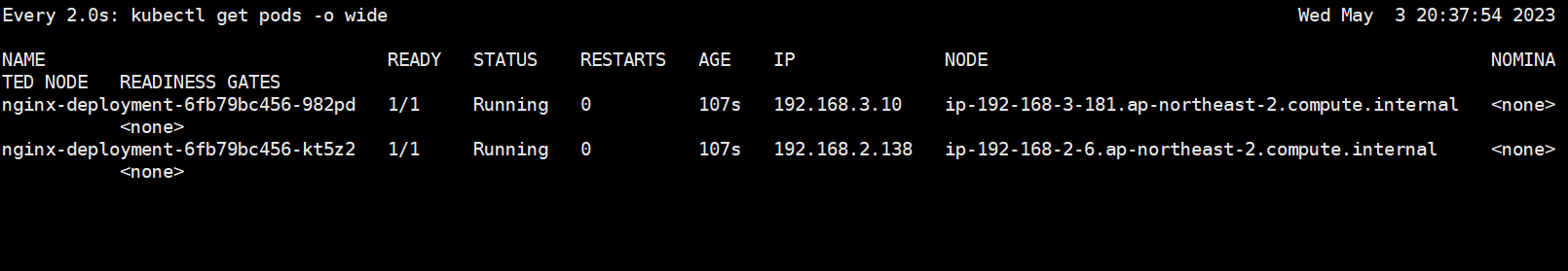 $ N2=$(kubectl get node --label-columns=topology.kubernetes.io/zone --selector=topology.kubernetes.io/zone=ap-northeast-2b -o jsonpath={.items[0].status.addresses[0].address})