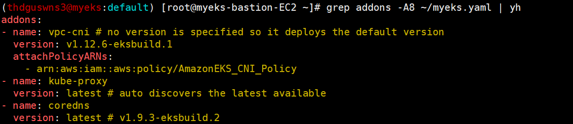 # 클러스터 배포 YAML 에서 Add-on 명시된 것 확인