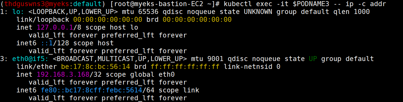 - 특정한 파드(kube-proxy, aws-node)는 호스트(Root)의 IP를 그대로 사용한다