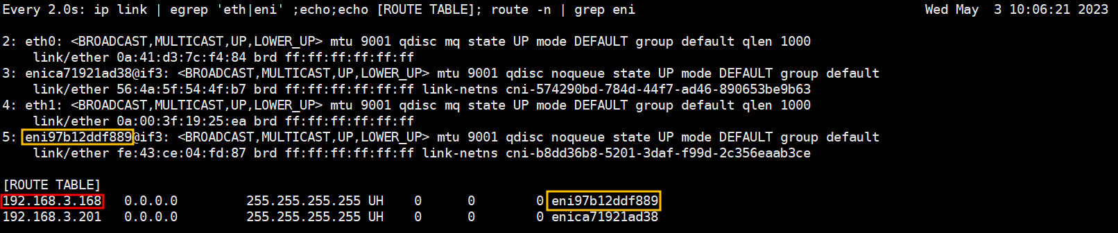 # 네트워크 정보 확인 : eniY는 pod network 네임스페이스와 veth pair