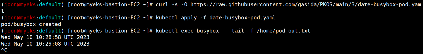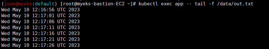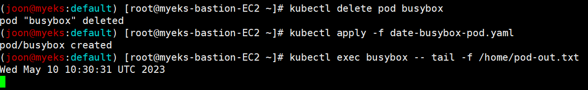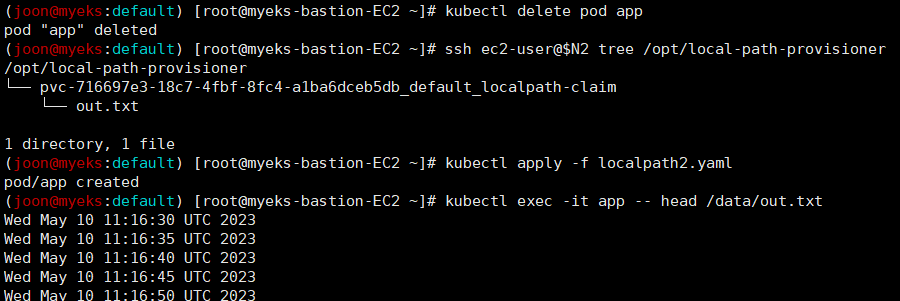 tail로 파일 내용을 확인해보면 기존 내용은 찾아볼 수 없습니다. 즉 이전에 삭제한 파드의 데이터는 모두 제거된 것입니다.