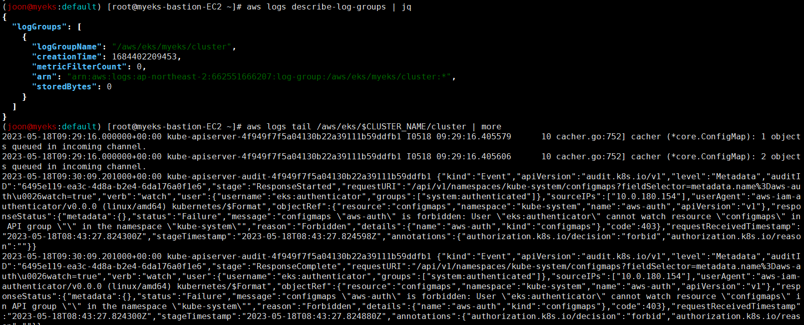 aws logs tail /aws/eks/$CLUSTER_NAME/cluster | more