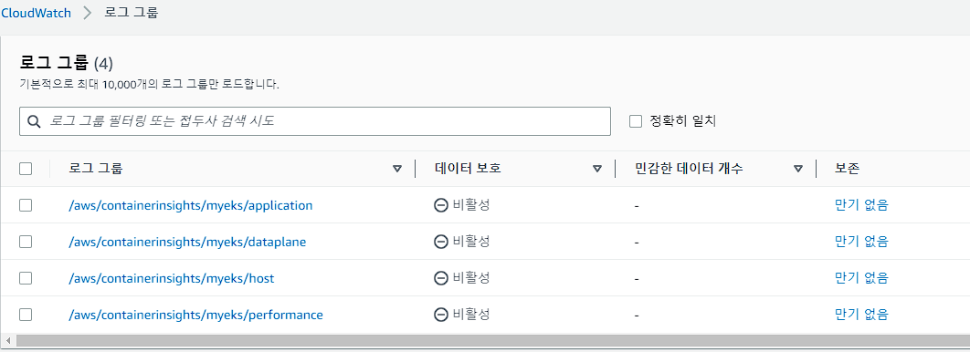 위와 같이 기본값으로 비활성화 되어있으며, 수집된 컨트롤 플레인 로그는 CloudWatch에서 볼 수 있다.