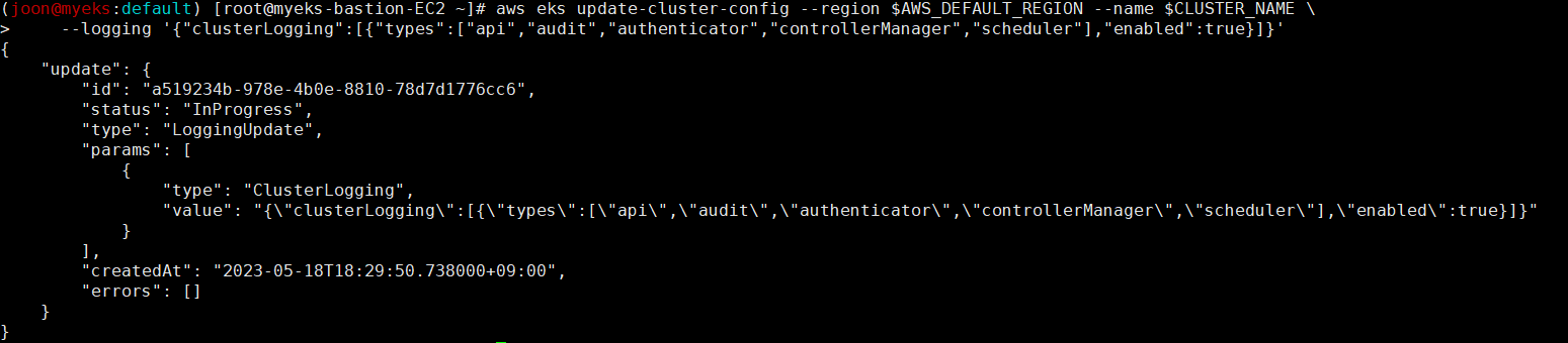 aws eks update-cluster-config --region $AWS_DEFAULT_REGION --name $CLUSTER_NAME \