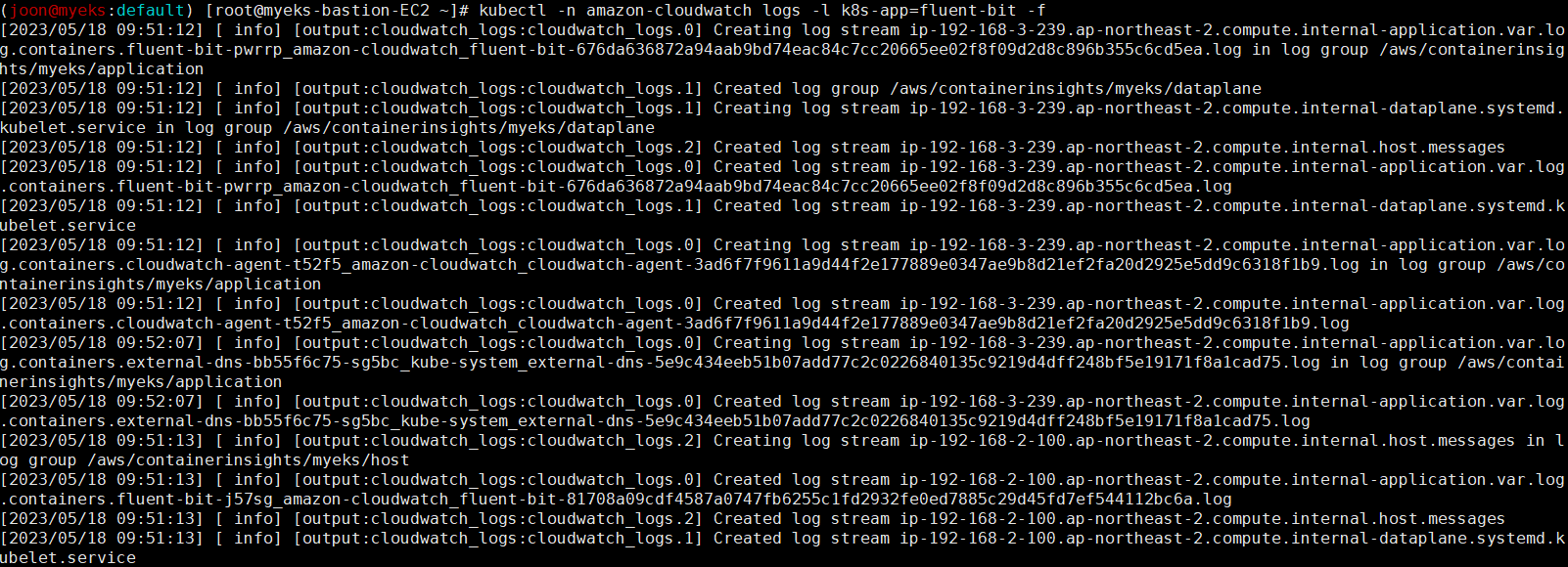 kubectl -n amazon-cloudwatch logs -l k8s-app=fluent-bit -f # 파드 로그 확인