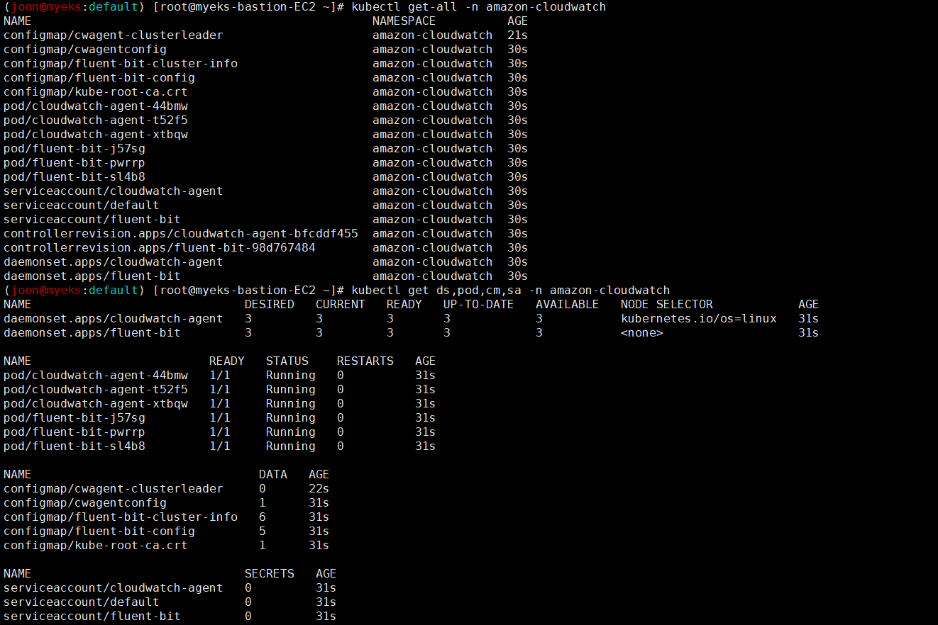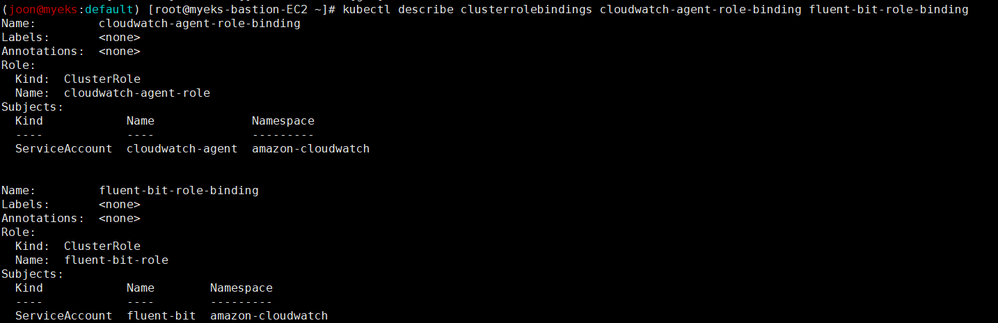 kubectl describe clusterrolebindings cloudwatch-agent-role-binding fluent-bit-role-binding # 클러스터롤 바인딩 확인