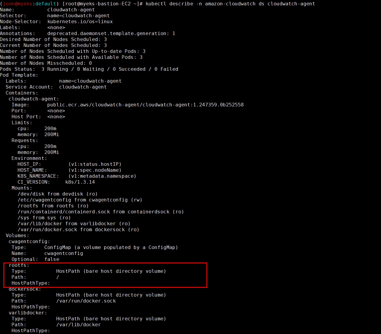 kubectl describe clusterrole cloudwatch-agent-role fluent-bit-role # 클러스터롤 확인