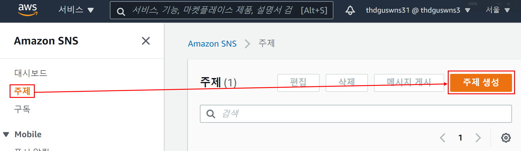 - 각 주제는 SNS 앤드포인트를 식별하는 고유한 이름을 가지기 때문에 게시자는 메시지를 게시하고 구독자는 알림을 받도록 등록이 가능하다.
