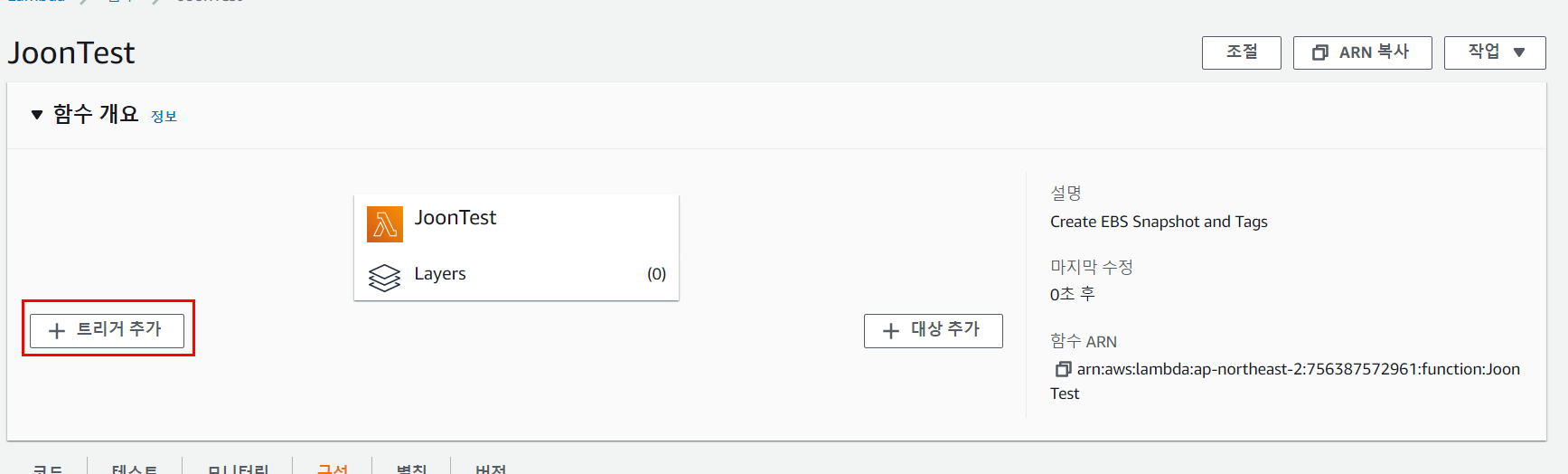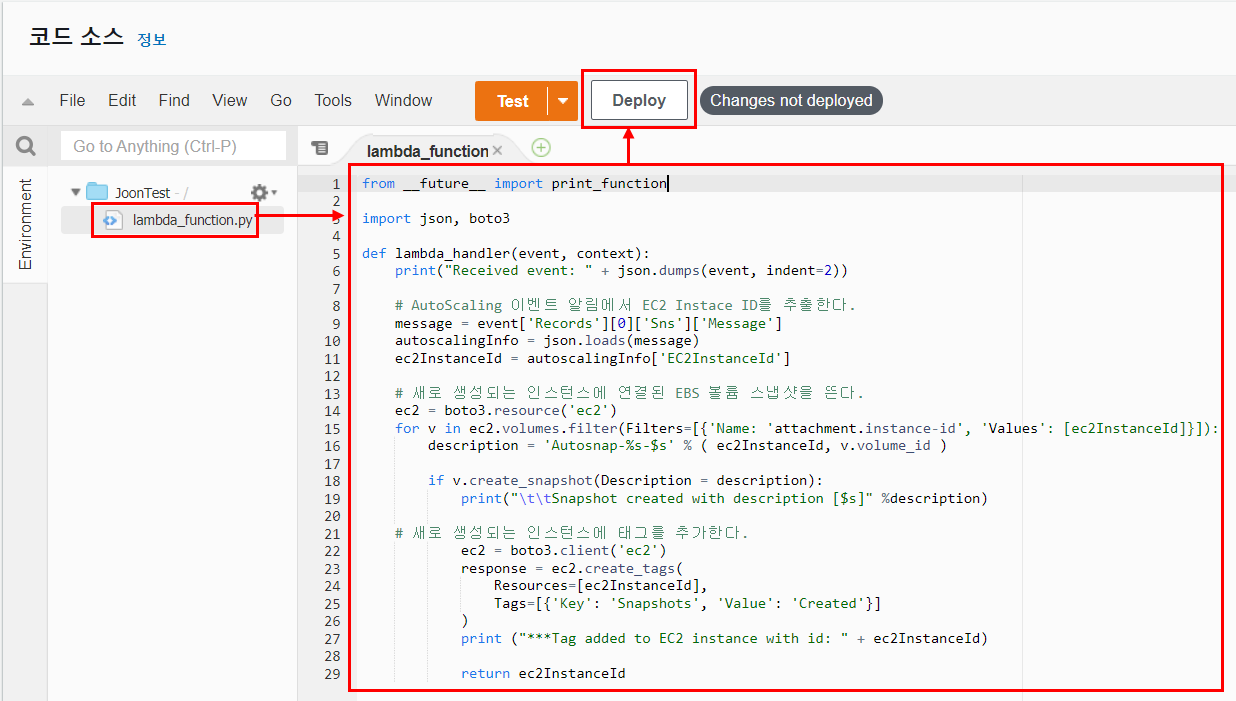 이 작업에서는 AutoScaling Group에 의해 Scale out 이벤트가 발생하면 SNS가 호출할 AWS Lambda를 생성할 것이다. Lambda 함수가 실행되면 새로 생성된 인스턴스에 태그를 지정하고 EBS 볼륨의 스냅샷을 생성한다.
