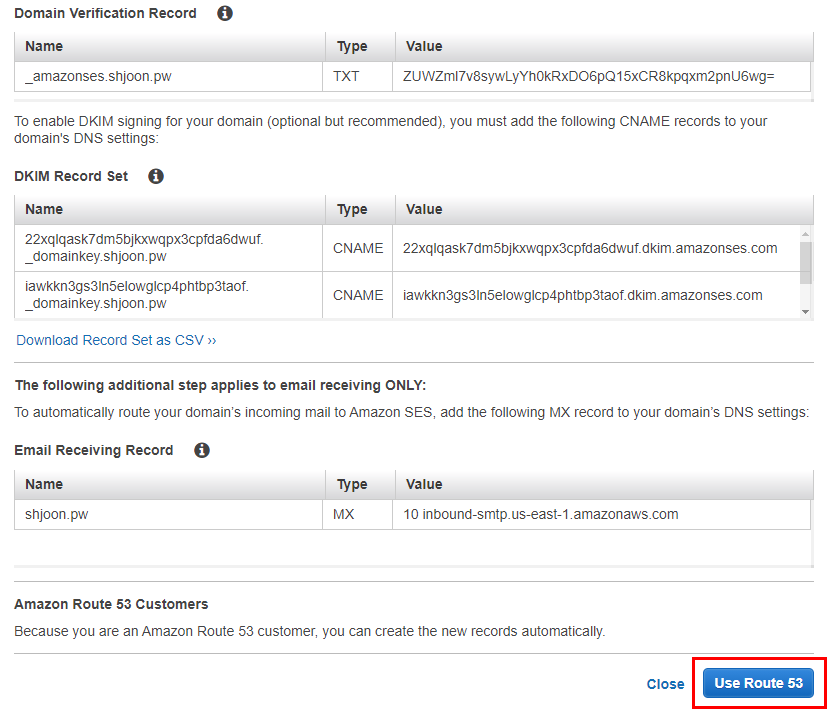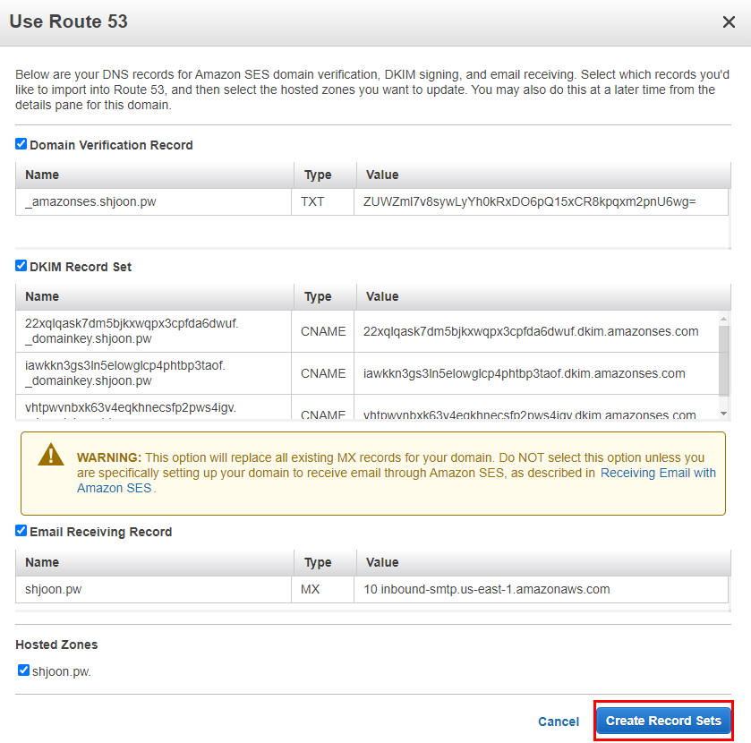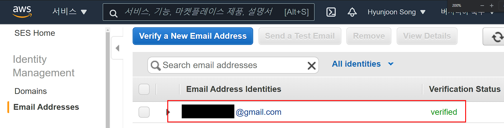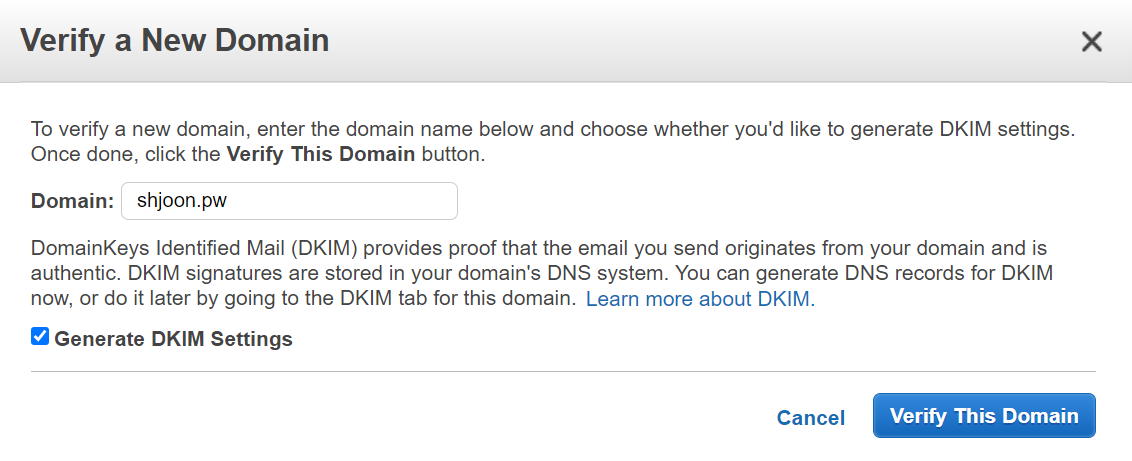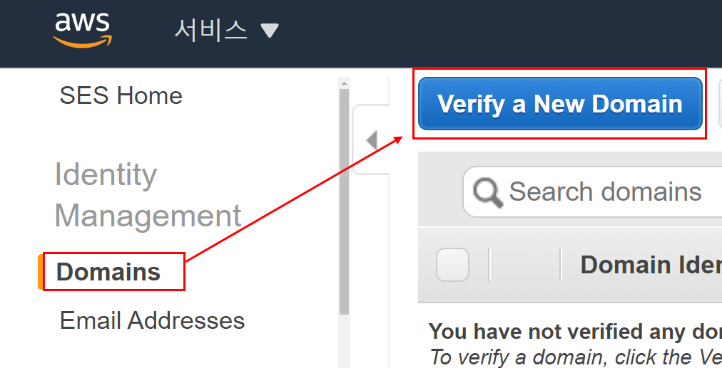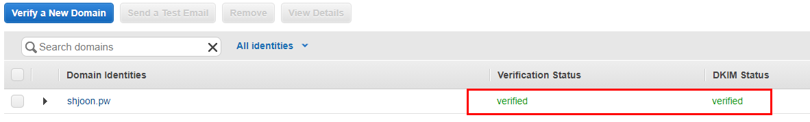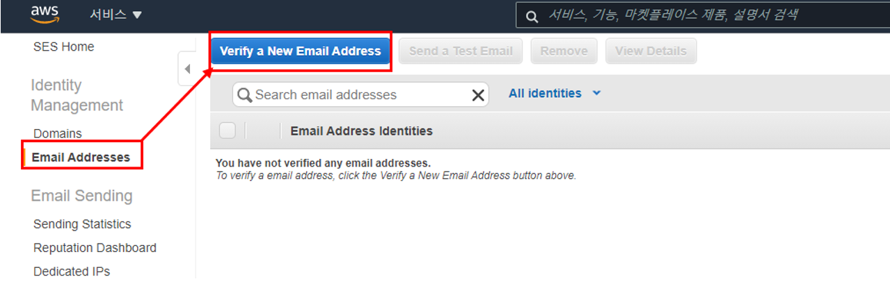 Amazon SES를 사용하려면 보내는 이메일과 도메인을 등록하고 인증해야한다. SES는 등록된 이메일 주소에서만 메일을 보낼 수 있다.