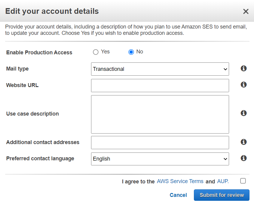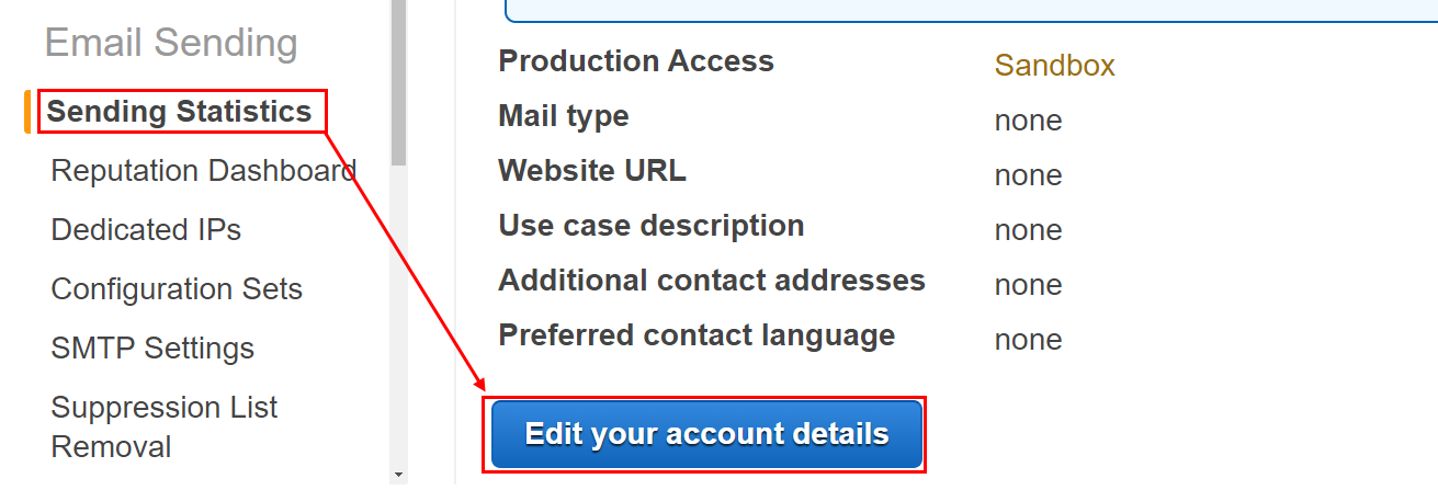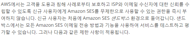SES를 사용하여 인증받지 않은 메일 주소로 이메일을 보내기 위해서는 Sandbox 환경에서 나가야한다. AWS에서 스팸의 목적으로 사용하는 것을 방지하기 위해 SES 신규 등록 고객에게 Sandbox라는 제한을 걸어둔다.
