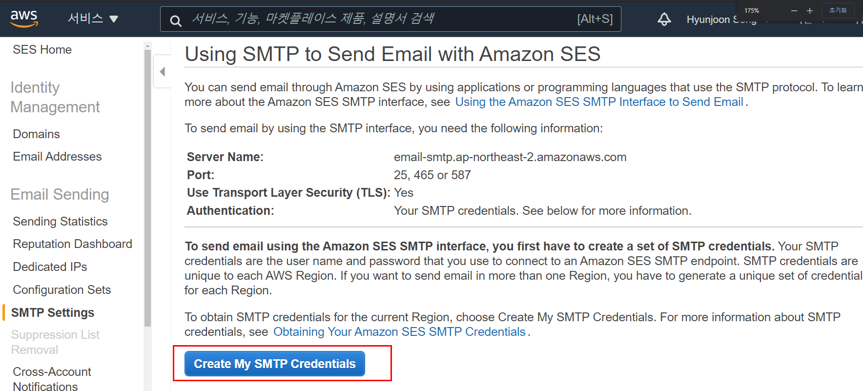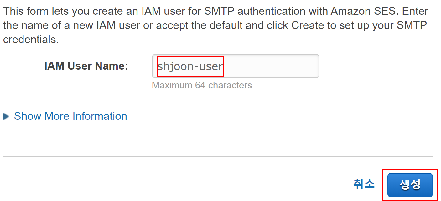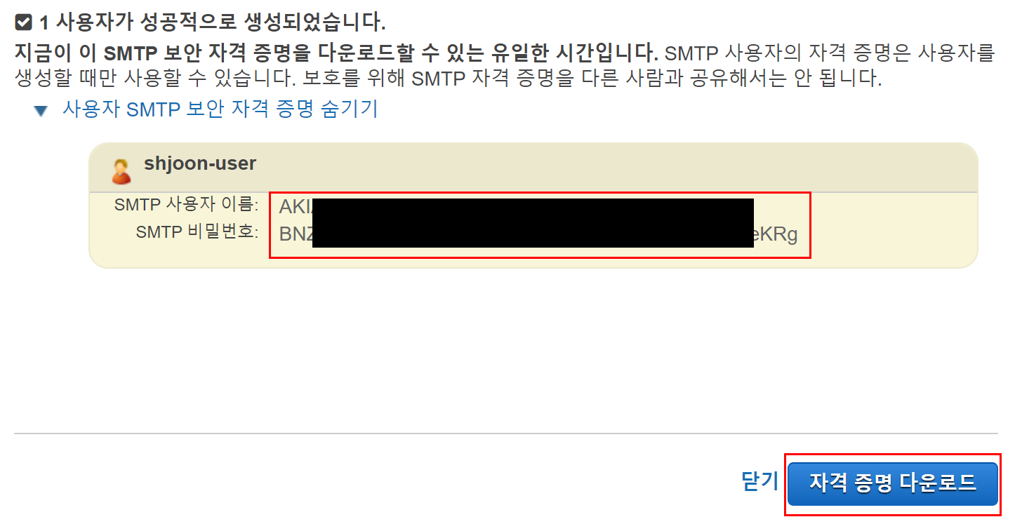 원하는 이메일 계정만큼 SMTP 자격증명 생성을 계속해도 된다.