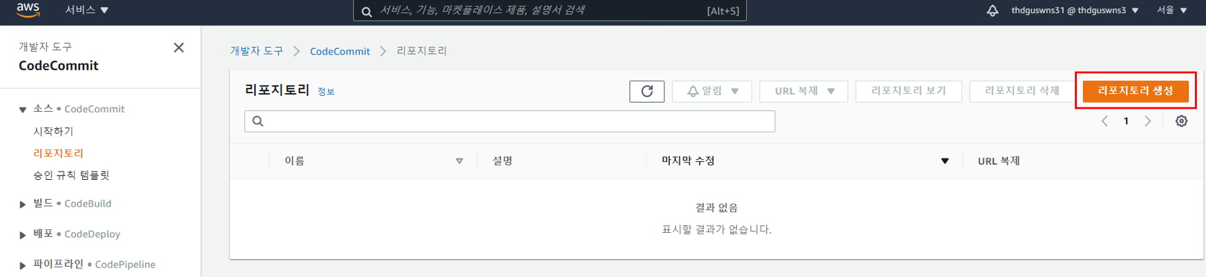1.1 CodeCommit 리포지토리 생성 및 연동