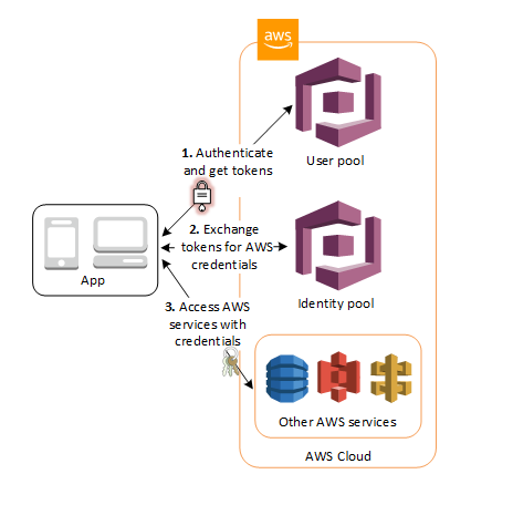 - Identity Pool(자격 증명 풀): 사용자에게 기타 AWS 서비스에 엑세스할 수 있는 권한을 부여한다. 즉, AWS 내의 서비스에 접근하기 위한 토큰 생성 기능을 담당하며 토큰은 JWT 기반이다.