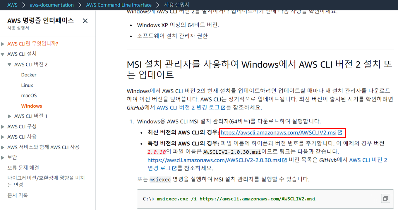 https://awscli.amazonaws.com/AWSCLIV2.msi (AWS CLI 설치 링크)