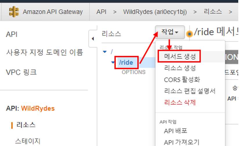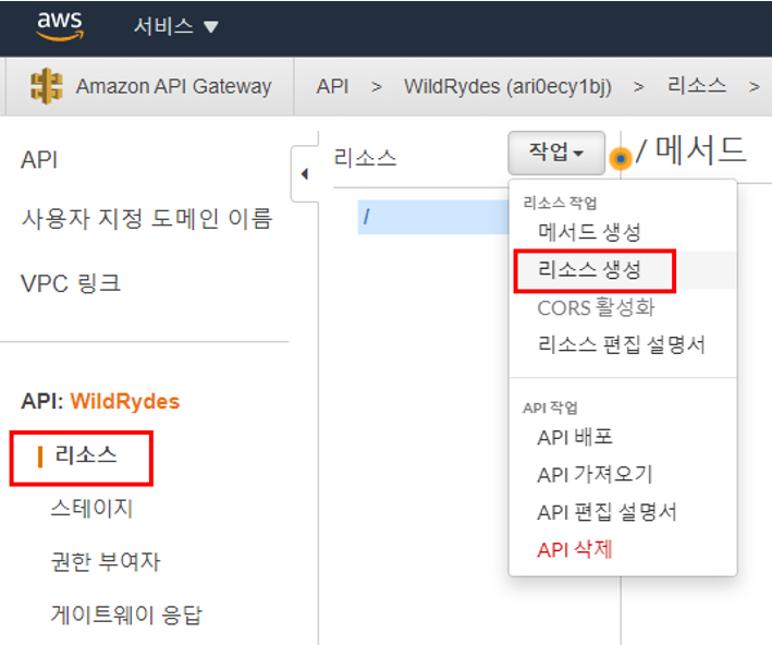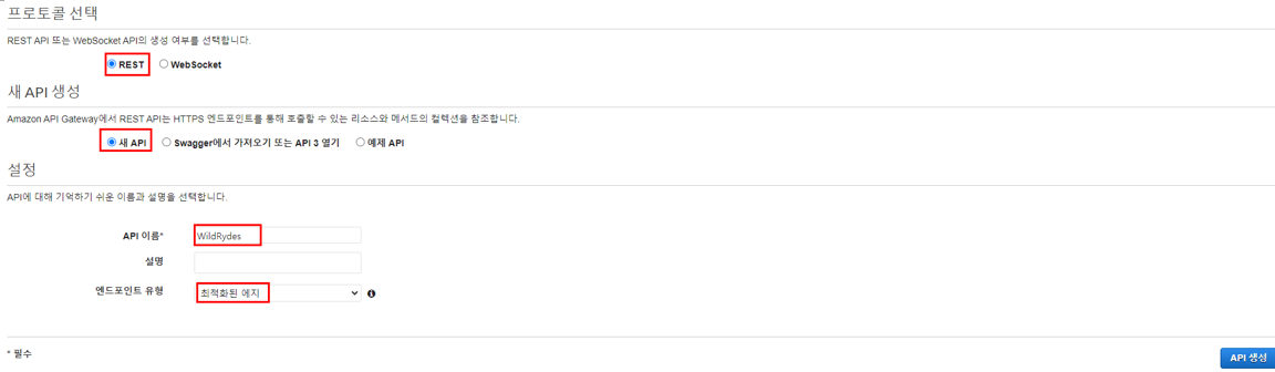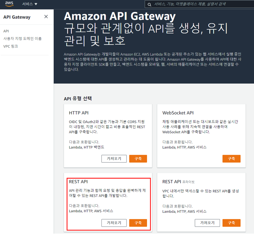 - Amazon API Gateway를 생성하여 Lambda 함수를 RESTful API로 공개한다.