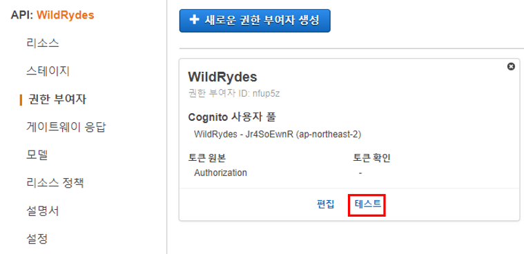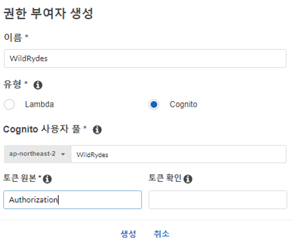 권한 부여자는 Amazon Cognito 사용자 풀을 사용하여 API에 대한 액세스를 제어하기 위해 생성한다.