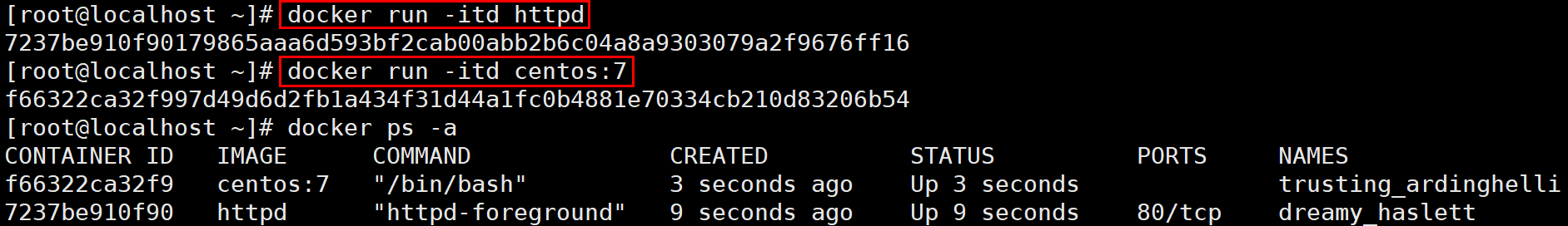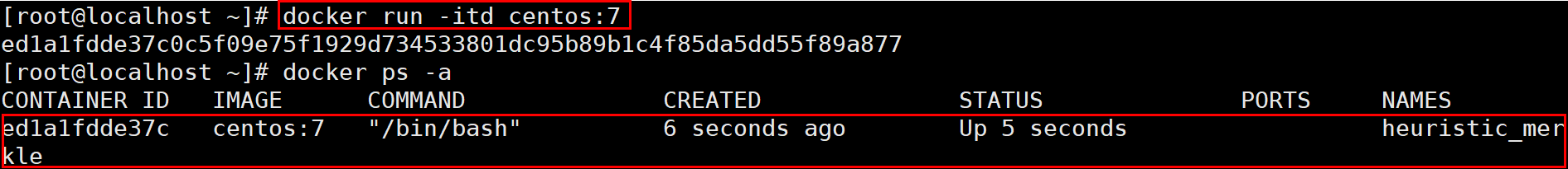 docker run -itd [쉘을 가진 이미지]: 지정한 이미지로 컨테이너를 생성 및 실행까지 한 번에 진행. -d는 dettach의 의미로 접속하지 않고 실행까지만 진행함을 의미한다.