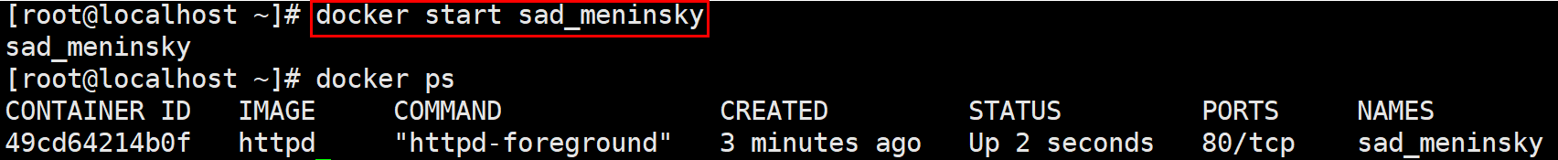 docker start [컨테이너 명]: 지정한 컨테이너를 실행한다.