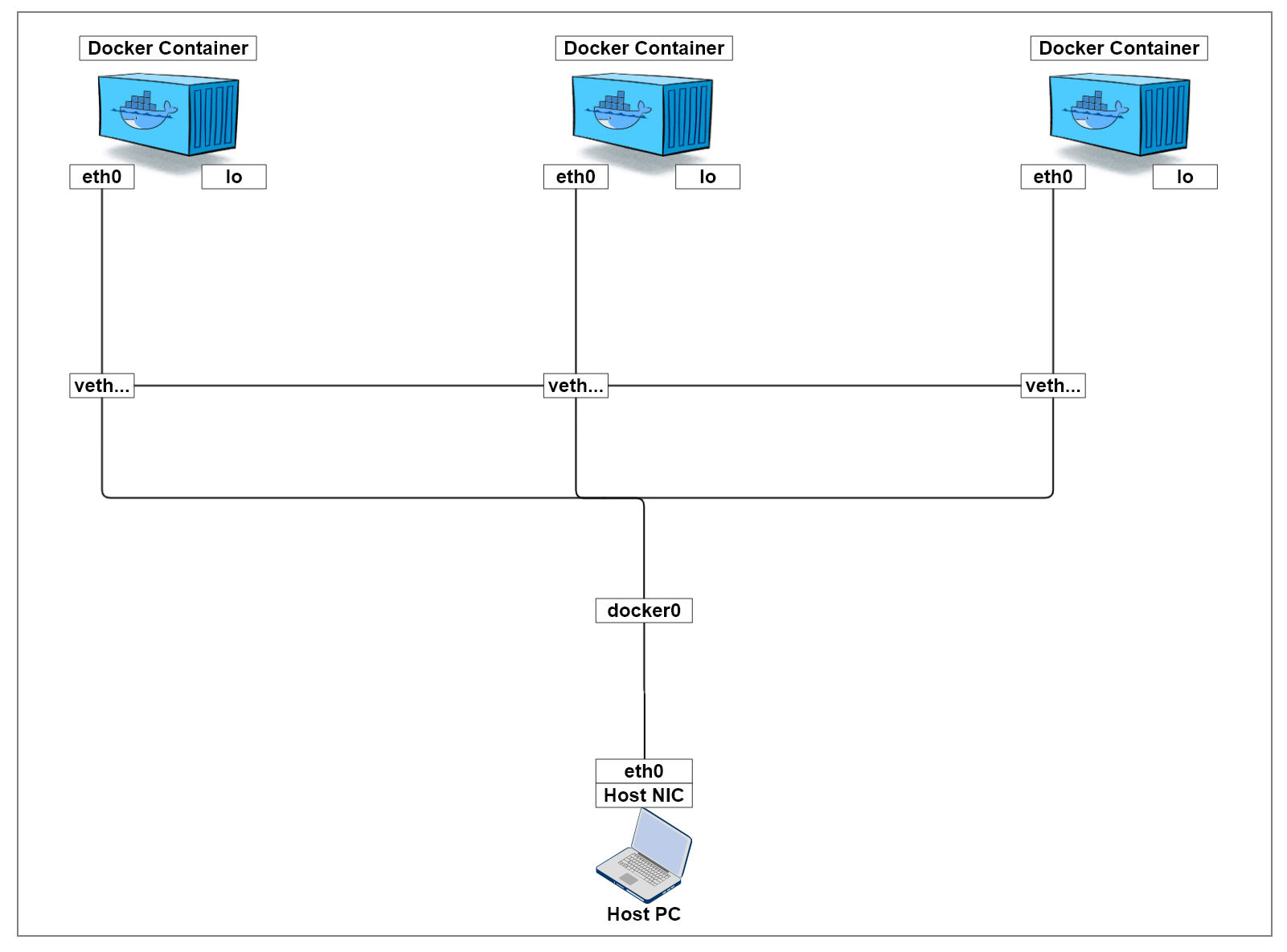 - 컨테이너가 외부와 통신이 필요할 때 각 컨테이너에 부여된 veth 네트워크 인터페이스를 통하여 통신한다.