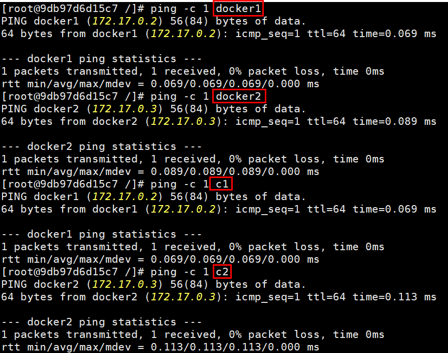 ping -c 1 c1 명령어로 c1에 핑을 1번 테스트하면 --link로 c1을 지정했기 때문에 정상적으로 ping이 동작한다.