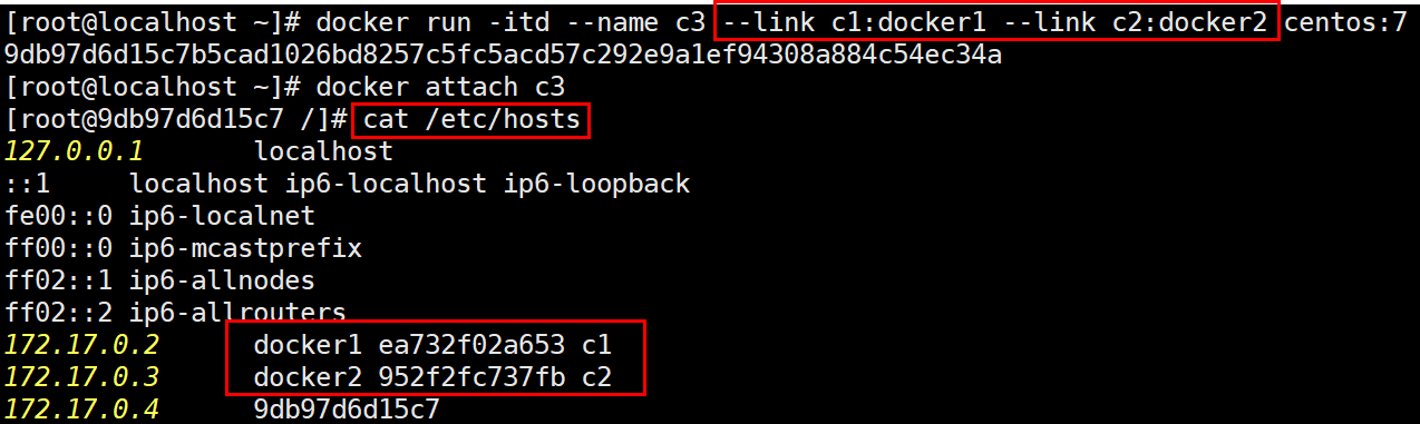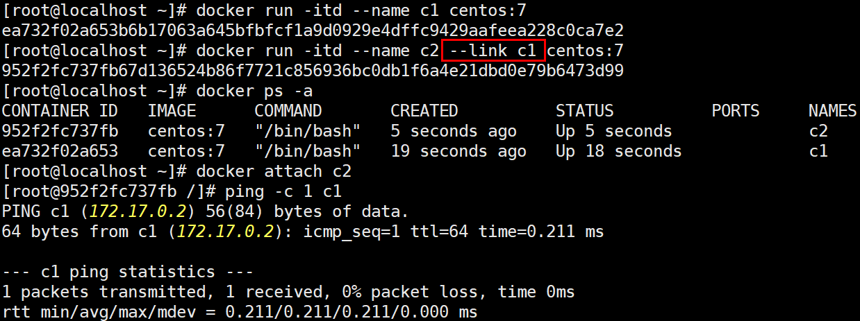docker run -itd --name c2 --link c1 centos:7 -> --link 옵션으로 c1을 지정하고 c2 컨테이너를 생성한다.