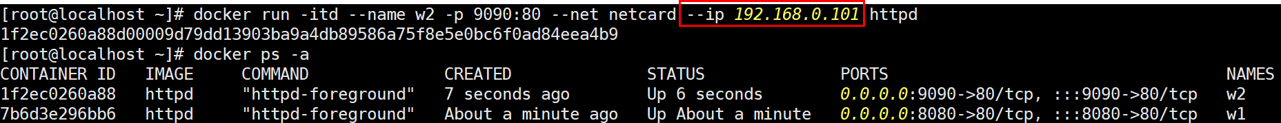 inspect 명령어를 사용하여 생성한 w2의 상세 정보를 살펴보면 192.168.0.101의 ip가 할당된 것을 볼 수 있다.