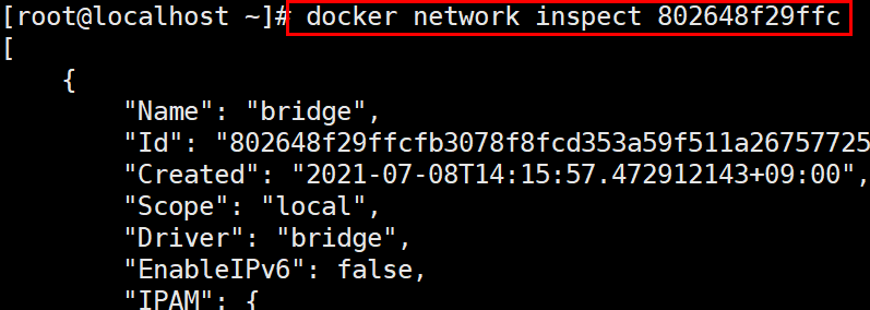 docker network inspect: 특정 네트워크 카드의 상세한 정보를 볼 수 있다. 네트워크 아이디를 직접 지정하거나 'bridge'와 같이 네트워크로 지정할 수 있다.