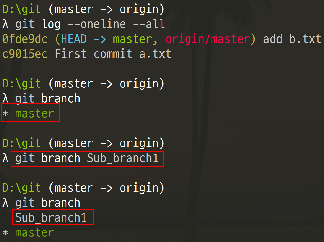 | git branch | : 로컬 브렌치의 목록을 출력 : -v 옵션을 사용하면 마지막 커밋 정보를 함께 출력 : [*]이 함께 표시되는 브렌치는 현재 HEAD가 가리키는 브렌치가 된다. |