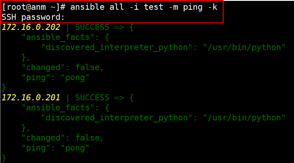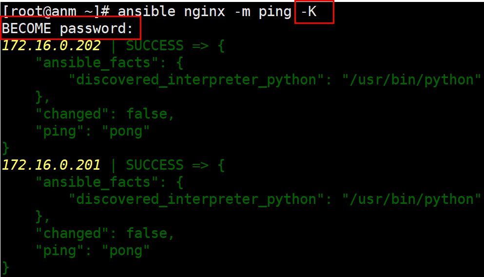 -k : (--ask-pass) 패스워드를 물어보도록 설정