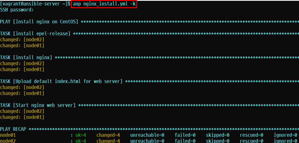 anp nginx_install_yml -k를 사용하여 플레이북을 실행시킨다.