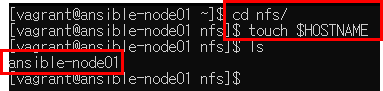 node01에 접속하여 touch $HOSTNAME을 입력하여 ansible-node01 파일을 생성한다.