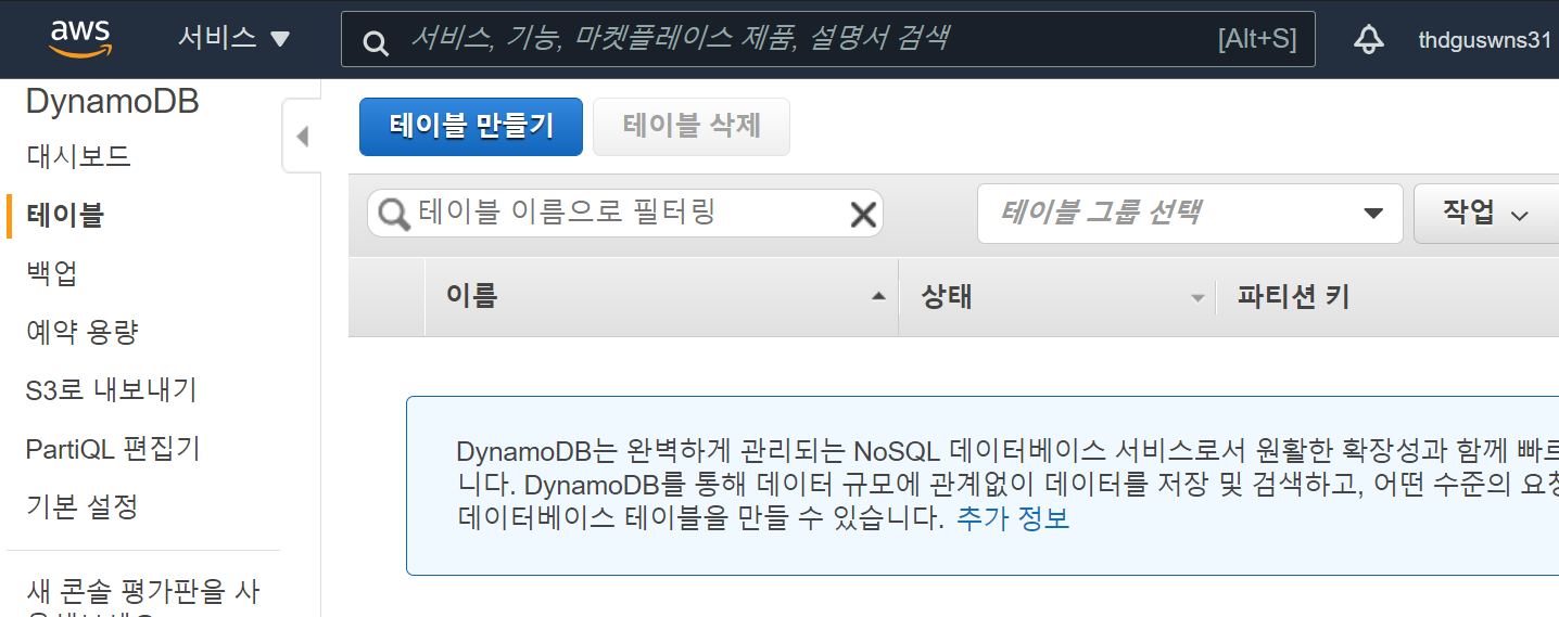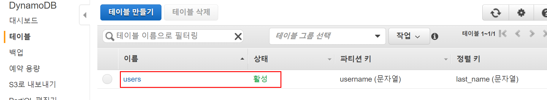 콘솔에서 생성된 테이블을 확인할 수 있다.
