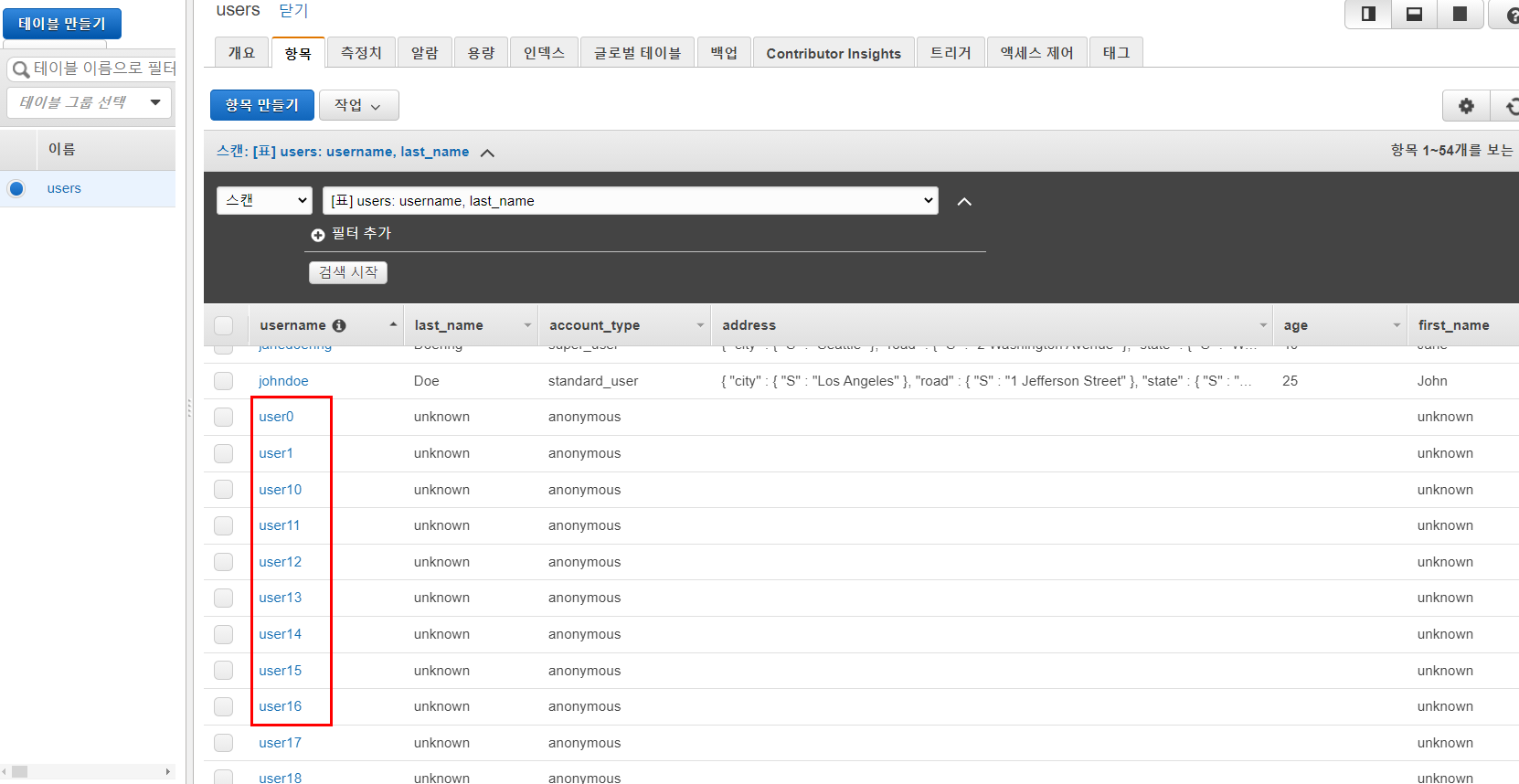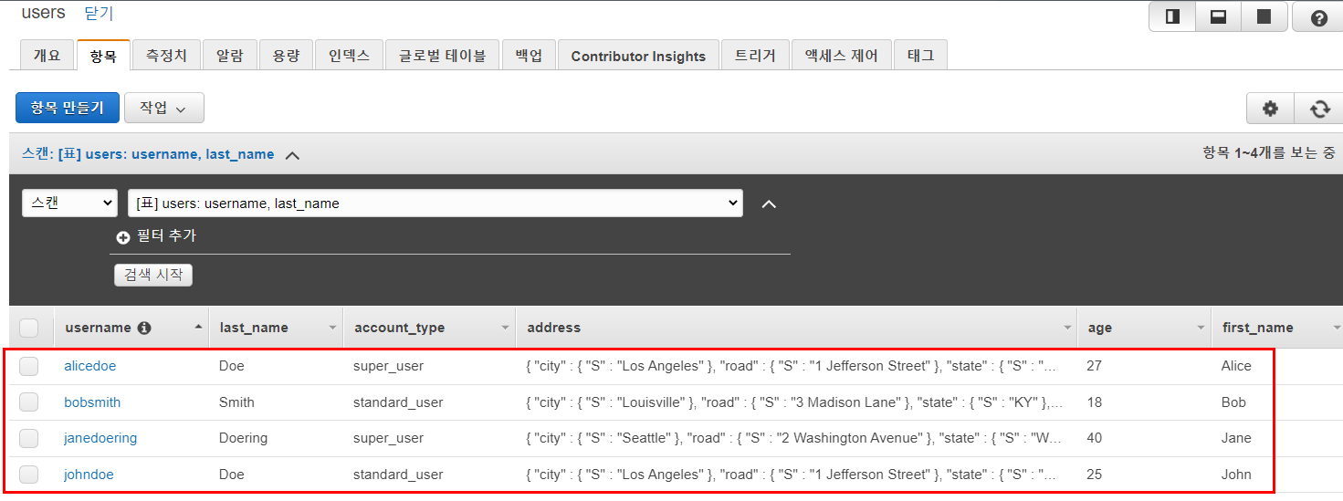 AWS 콘솔에 접속하여 확인하면 위와 같이 입력한 데이터가 테이블에 등록되어있다.