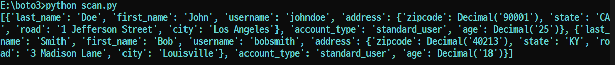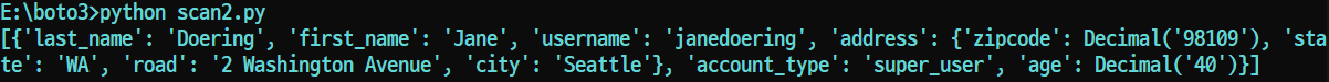 위 코드는 first_name 값이 J로 시작(begins_with)하고 account_type이 super_user와 동일한 대상에 대해 값을 출력하는 것이다.