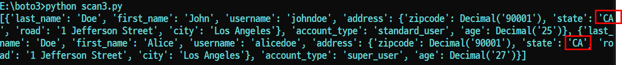 세 번째 예제 코드는 address.state 속성값이 CA와 같은(eq) 값을 scan하여 출력하는 것이다.