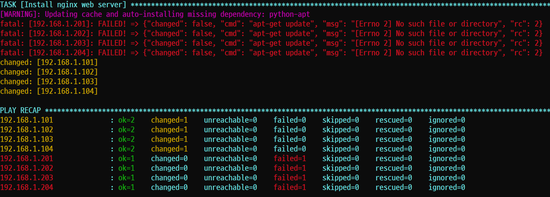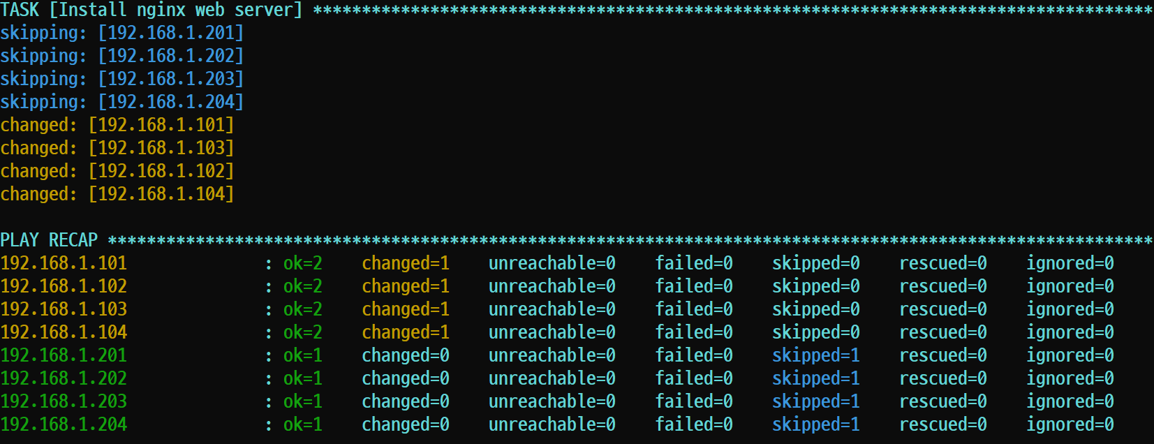 when을 사용하지 않으면 모든 노드에 대해 코드가 동작하기 때문에 우분투쪽은 apt-get 명령어를 통해 정상적으로 nginx가 설치되지만 CentOS는 yum을 사용해야되기 때문에 설치가 진행되지 않고 Failed가 출력된다.